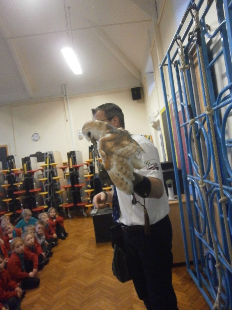 Silverband Falconry came into school and showed off some of his birds in a whole school assembly. He flew three birds in assembly; a European Eagle Owl, a Barn Owl and a Harris Hawk.